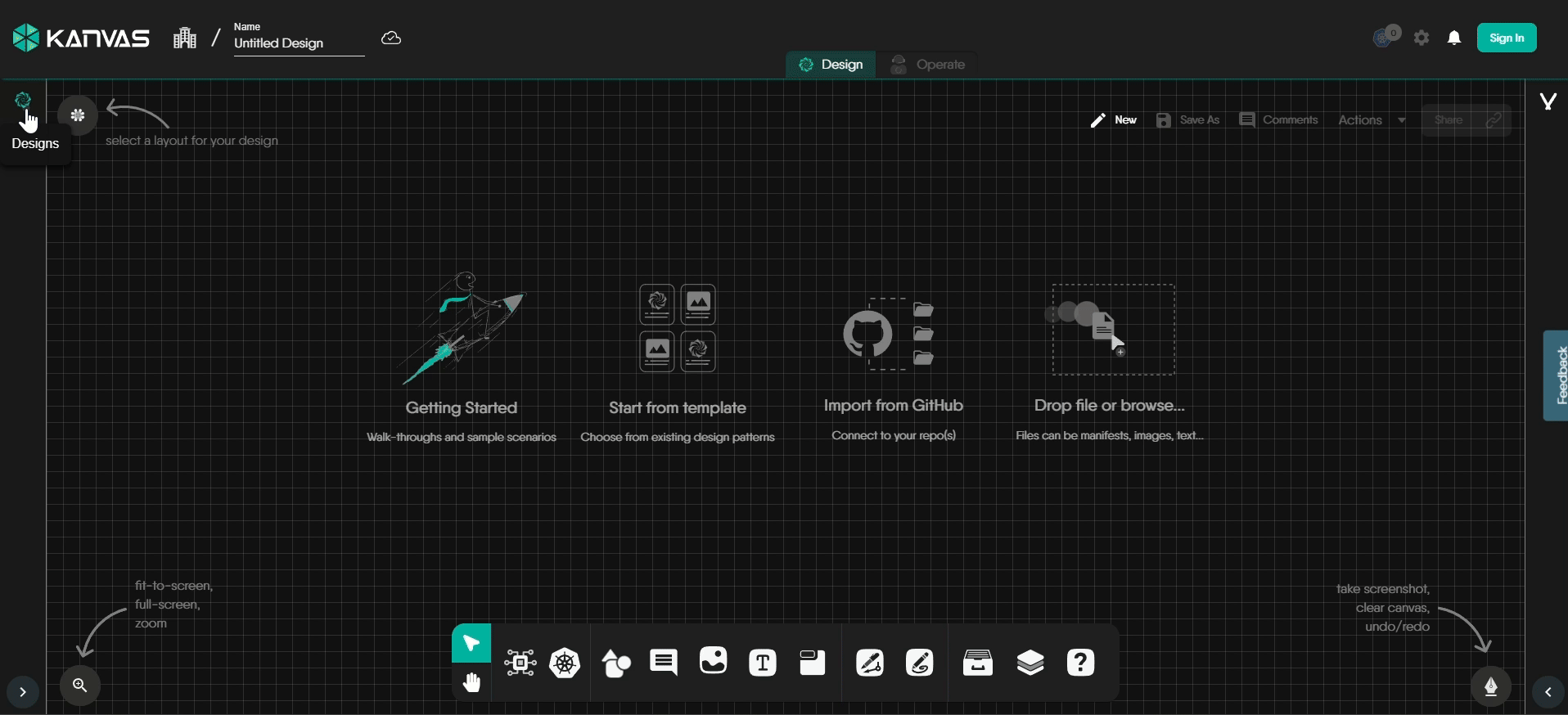 • In the designs panel, locate your design and hover over it to access quick actions. Select the info button (marked with an "i") and add any necessary details for the review process, such as relevant technologies, descriptions, and considerations and click Publish button. Once approved by the Maintainers, your design becomes available to the broader community in Kanvas catalog. Animated walkthrough of creating a design from scratch in the Kanvas Designer